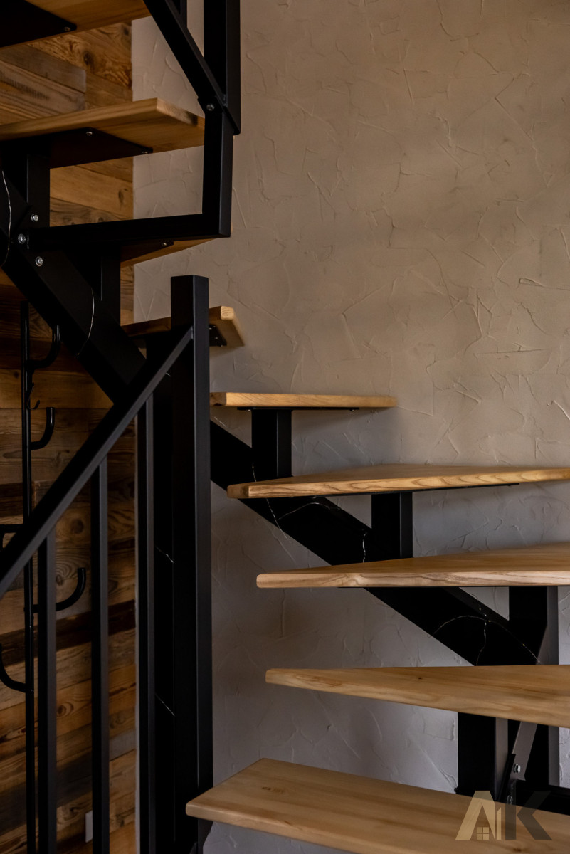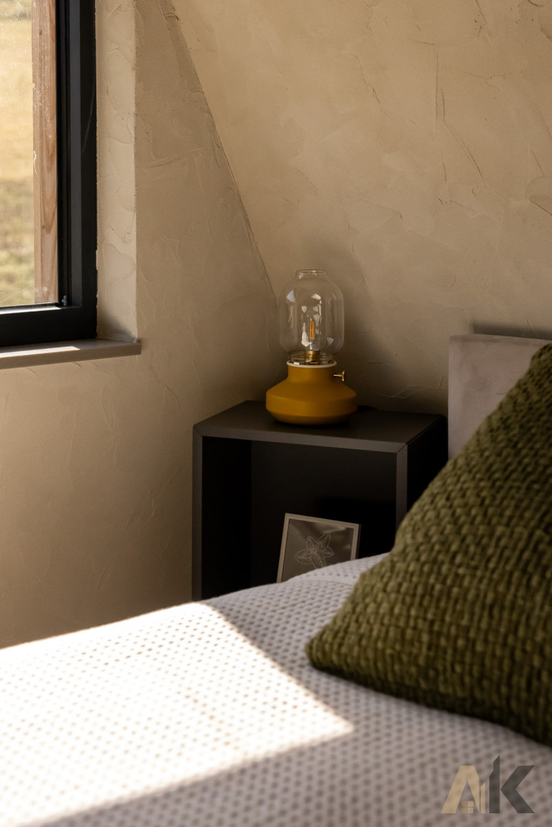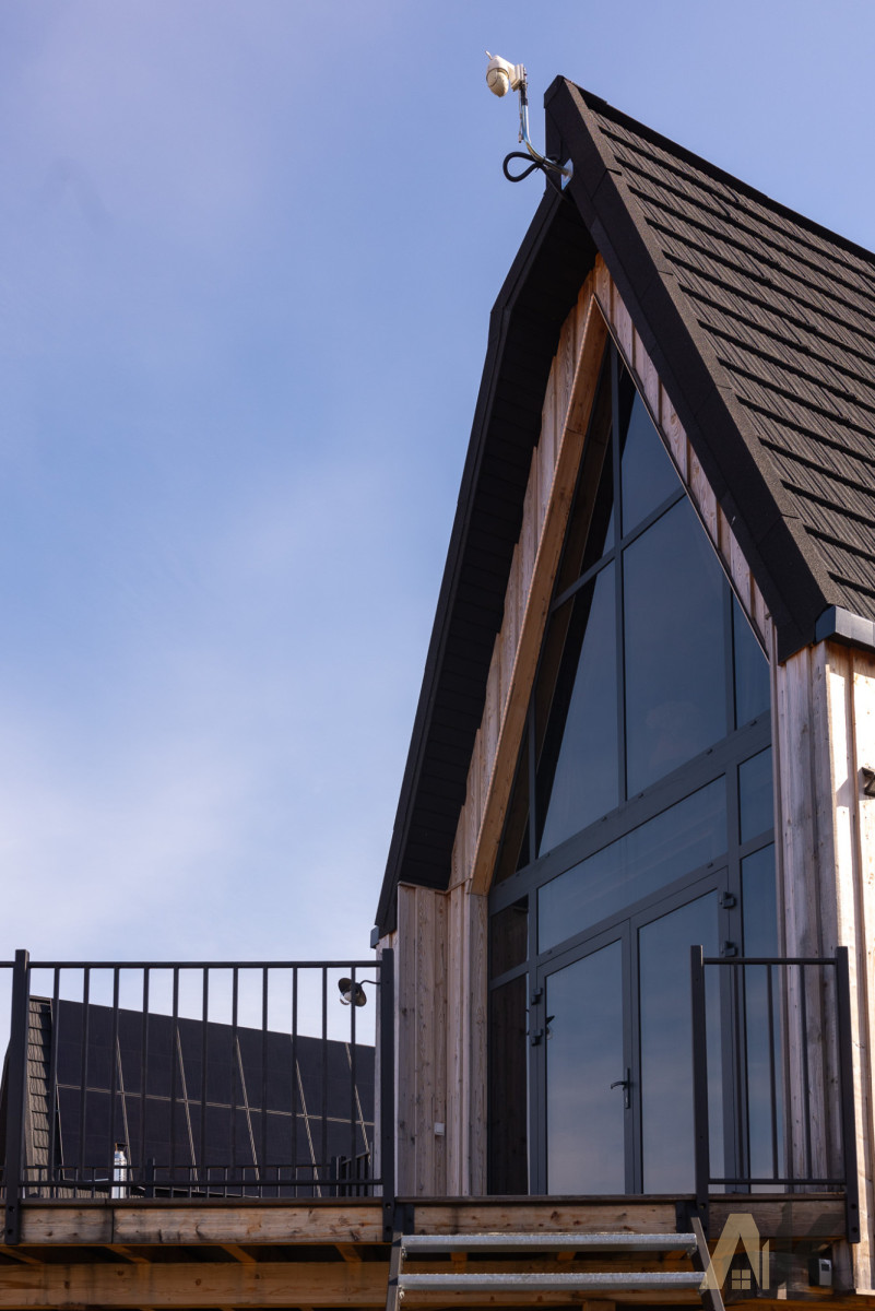 Ściany z drewna klejonego, ocieplone wełną; drewniane podłogi i duże aluminiowe okna.Ogrzewanie: