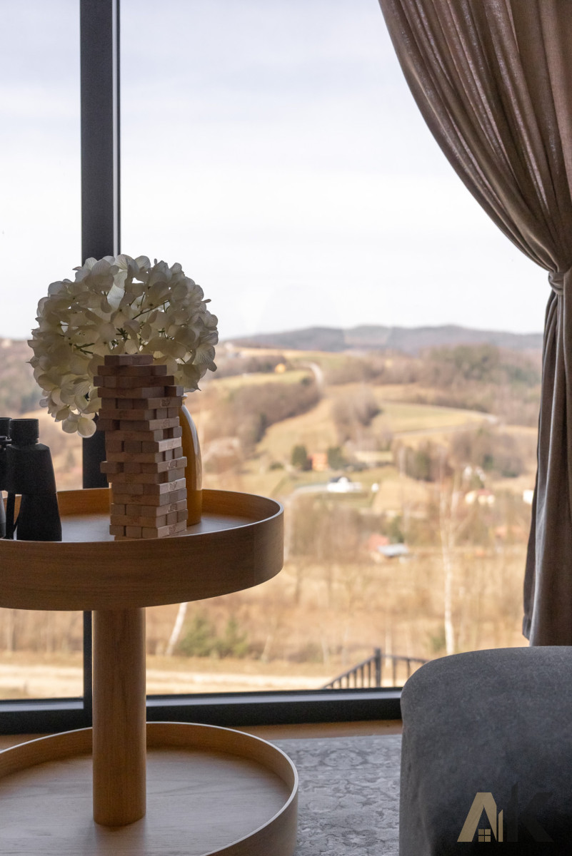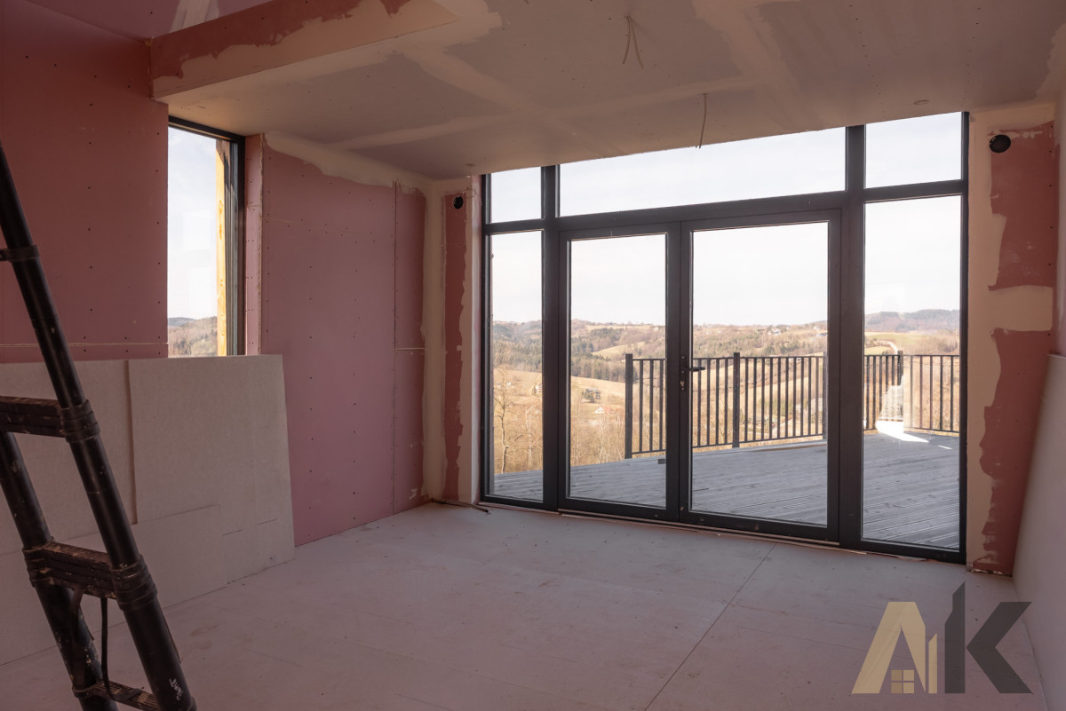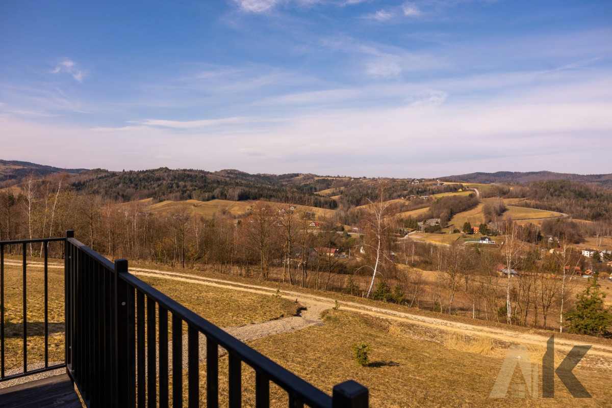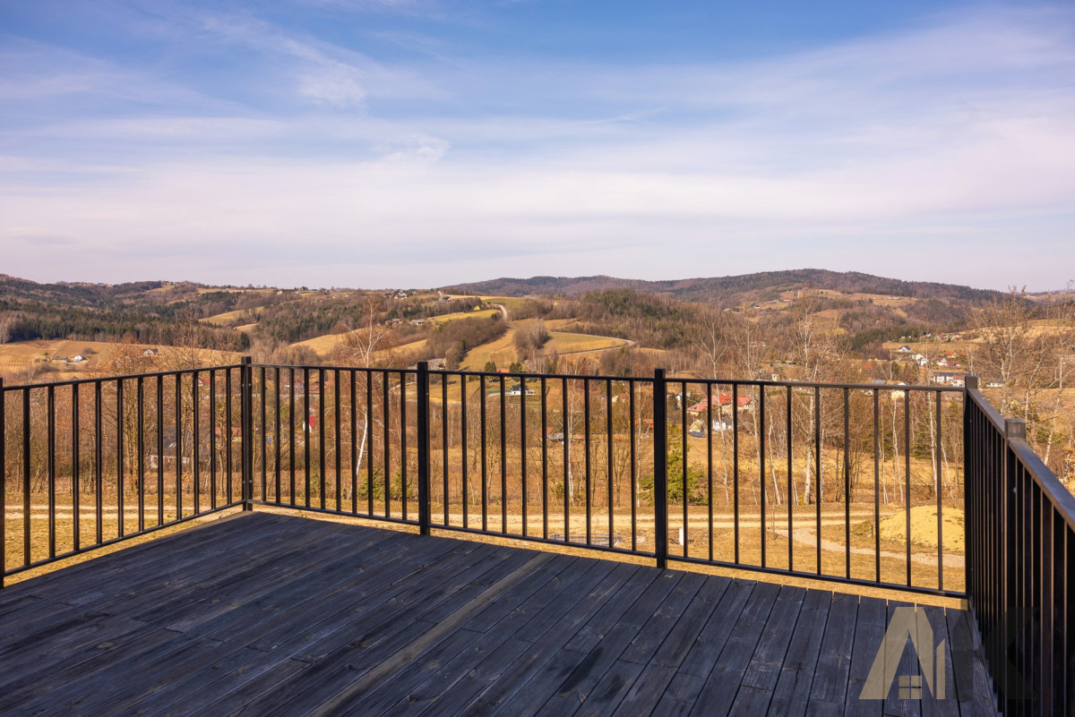 Nieograniczony Widok: Dom położony na zboczu, z imponującym tarasem (30 m²) wykonanym ze świerku norweskiego, oferującym kojący widok na panoramę Małopolski.