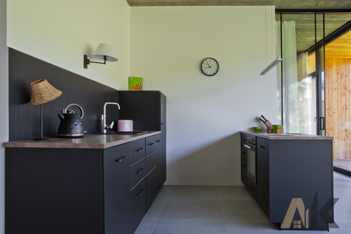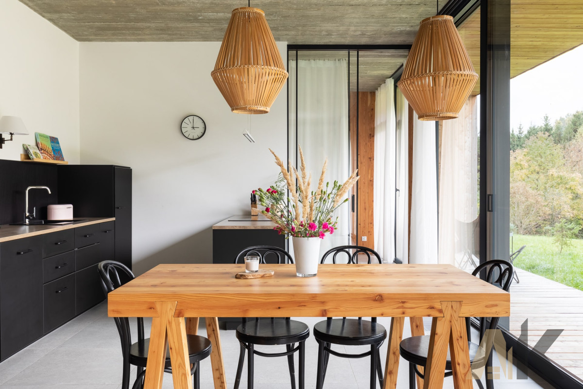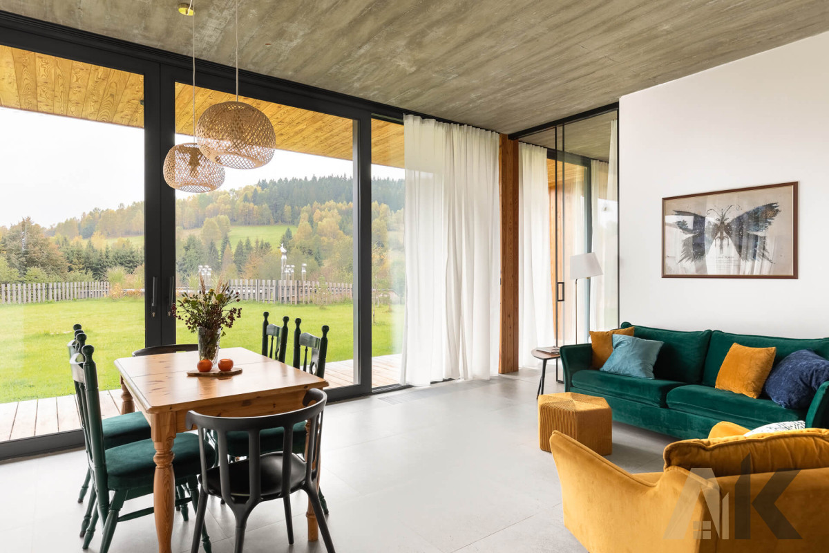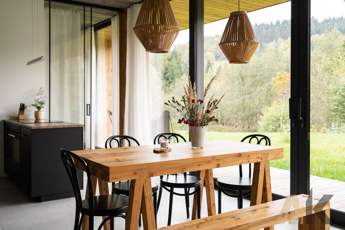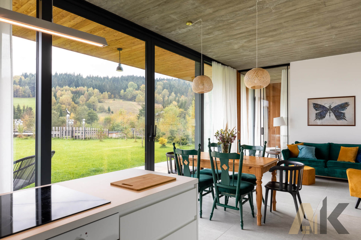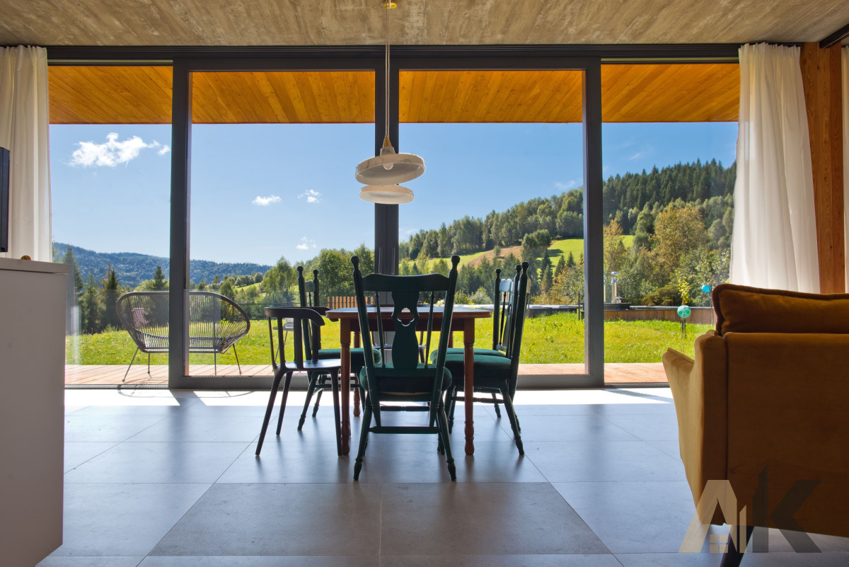 Spektakularne przeszklenia: Salon z kuchnią to przestrzeń, w której natura wchodzi do środka. Widok na góry i las jest tu integralną częścią wnętrza.