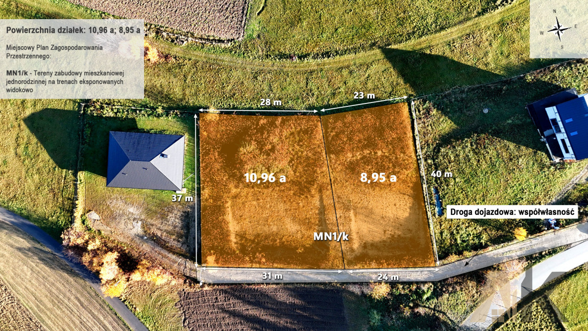 OPIS NIERUCHOMOŚCINieruchomości o powierzchni 10,96 a oraz 8,95 a położone są w spokojnej, widokowej części miejscowości Jamnica. Działki mają regularny kształt zbliżony do kwadratu (ok. 31 m x 37 m i 24 m x 40 m) oraz płaskie ukształtowanie terenu, co daje szerokie możliwości zagospodarowania i ułatwia proces budowy.