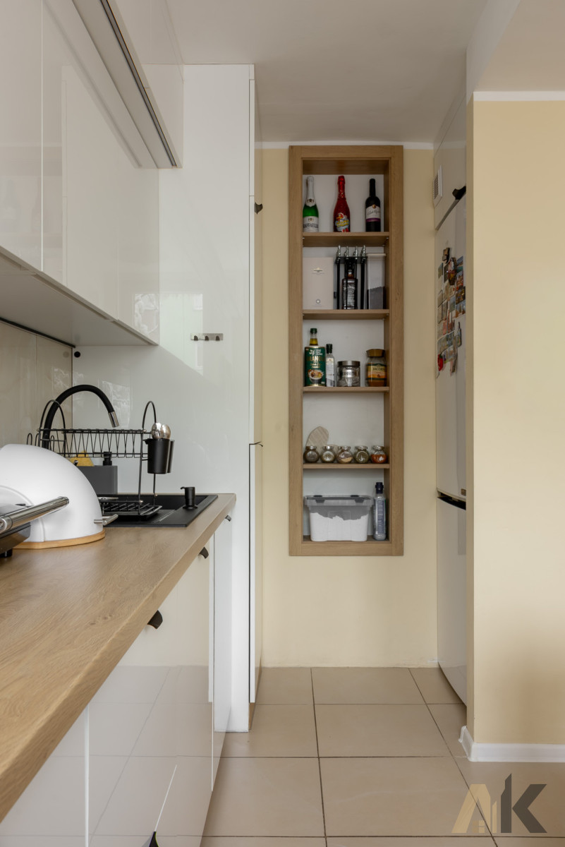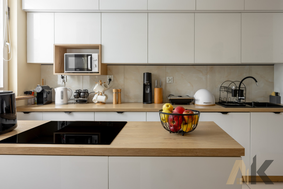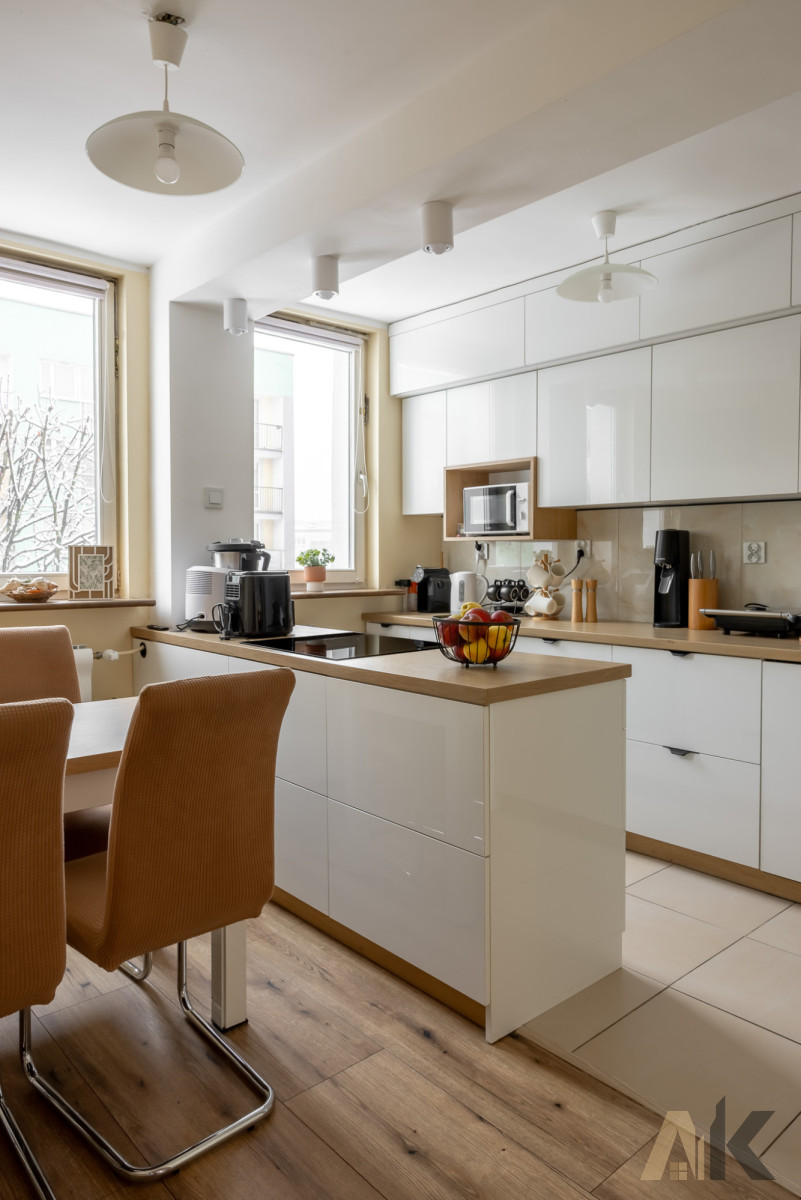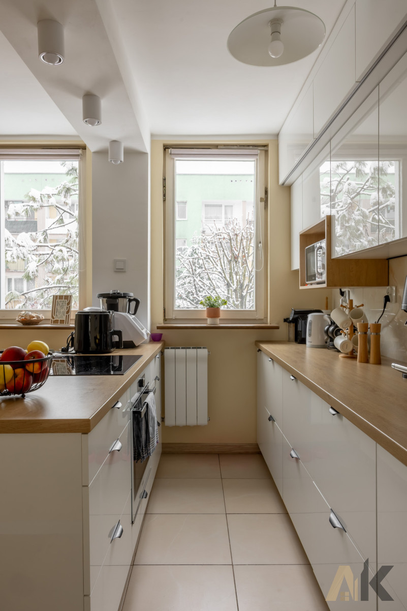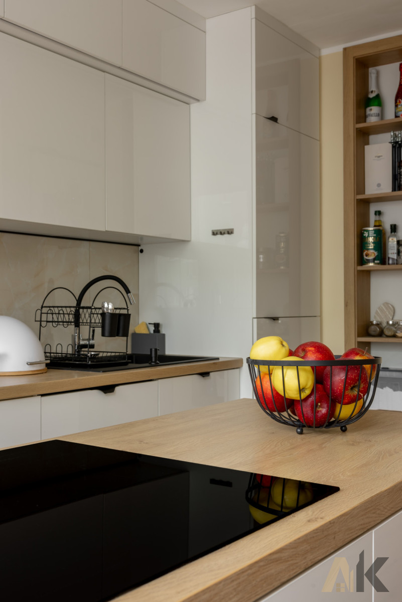 Wyposażenie kuchni: meble w zabudowie, lodówka, zmywarka, pralka, płyta indukcyjna, piekarnik, zlewozmywak.