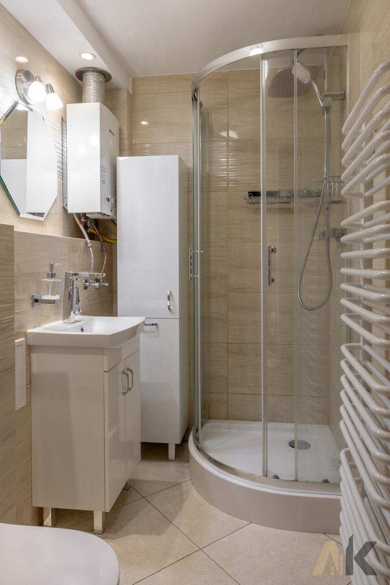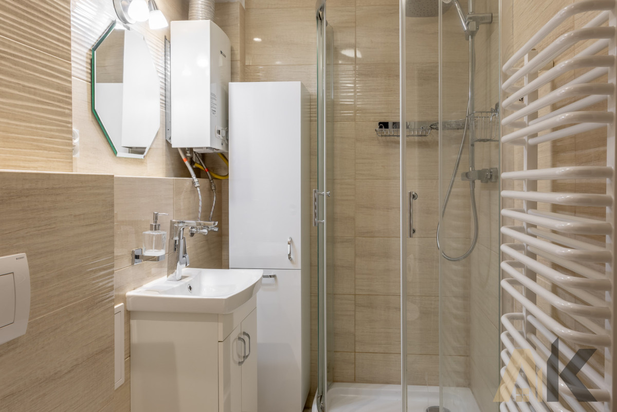 Mieszkanie położone jest w budynku w doskonałym stanie. Lokal został starannie wykończony i wyposażony, dzięki czemu jest gotowy do zamieszkania bez dodatkowych nakładów. Zastosowano wysokiej jakości materiały wykończeniowe: podłogi z paneli winylowych, klasycznych paneli oraz eleganckich płytek. W nieruchomości został przeprowadzony generalny remont instalacji elektrycznych, hydraulicznych oraz prac wykończeniowych.