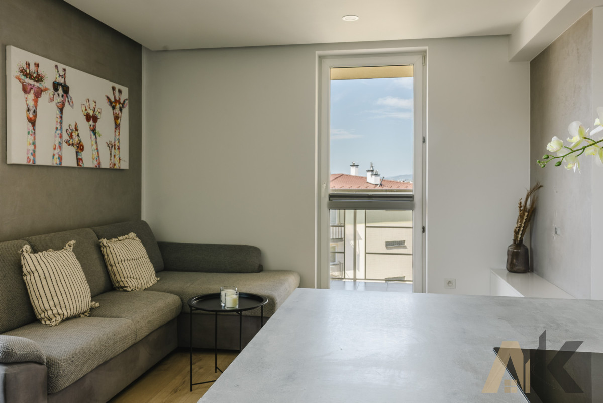 Salon: sofa, stolik z krzesłami, wyjściem na słoneczny balkon.