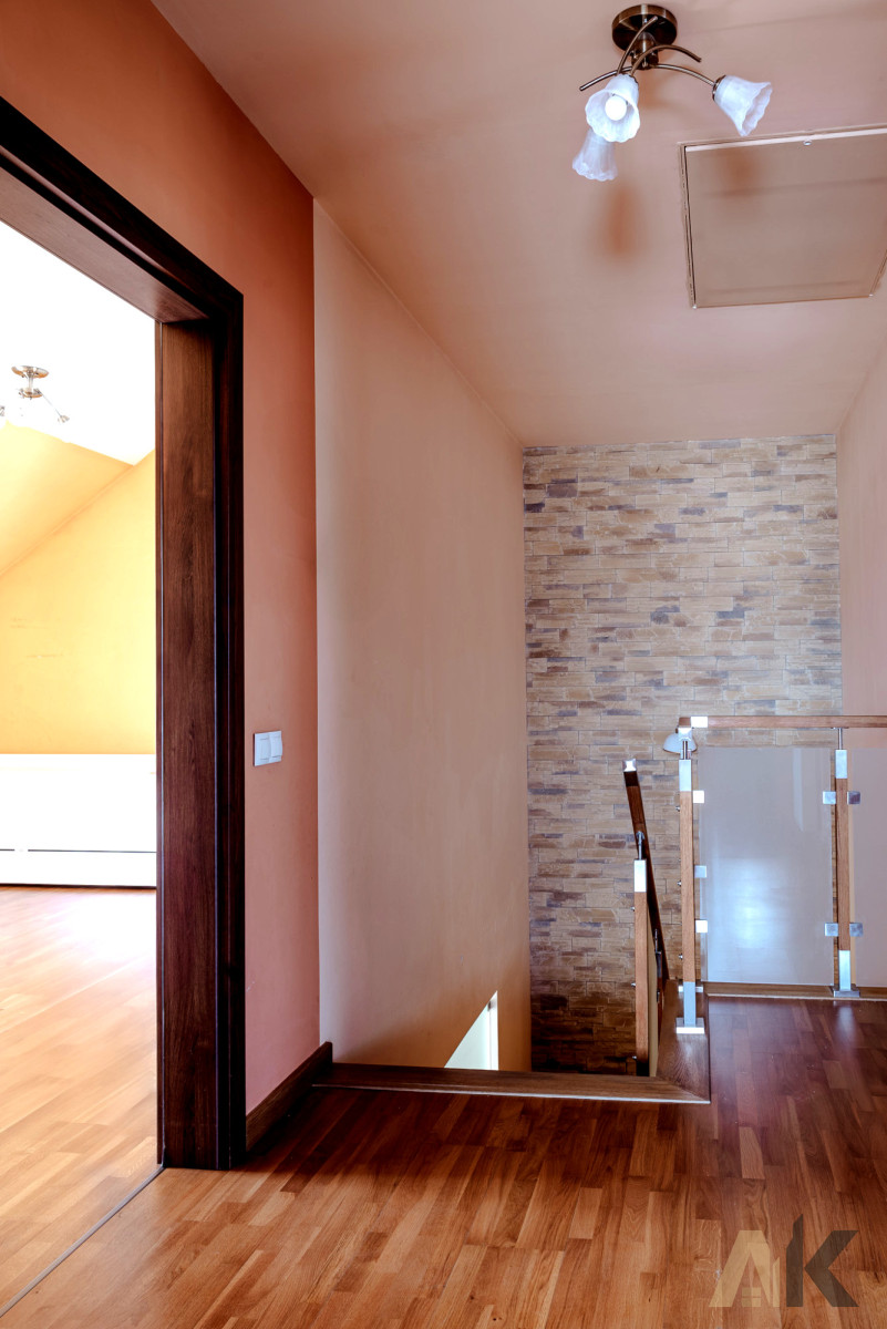 Na podłodze na parterze znajduje się deska barlinecka to rodzaj podłogi wykonanej w 100% z naturalnego drewna, składającej się z trzech warstw ułożonych w nowoczesnej konstrukcji krzyżowej. Ta warstwowa budowa zapewnia stabilność podłogi i nadaje wnętrzom przytulny charakter. Natomiast na piętrze z deski. Wnętrza są otwarte, dobrze doświetlone i wygodne w codziennym użytkowaniu.