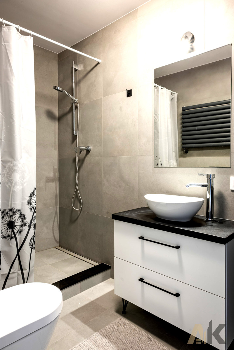 - Mieszkanie 1: 3 pokoje, kuchnia z balkonem, łazienka, schowek, korytarz, garaż w bryle budynku