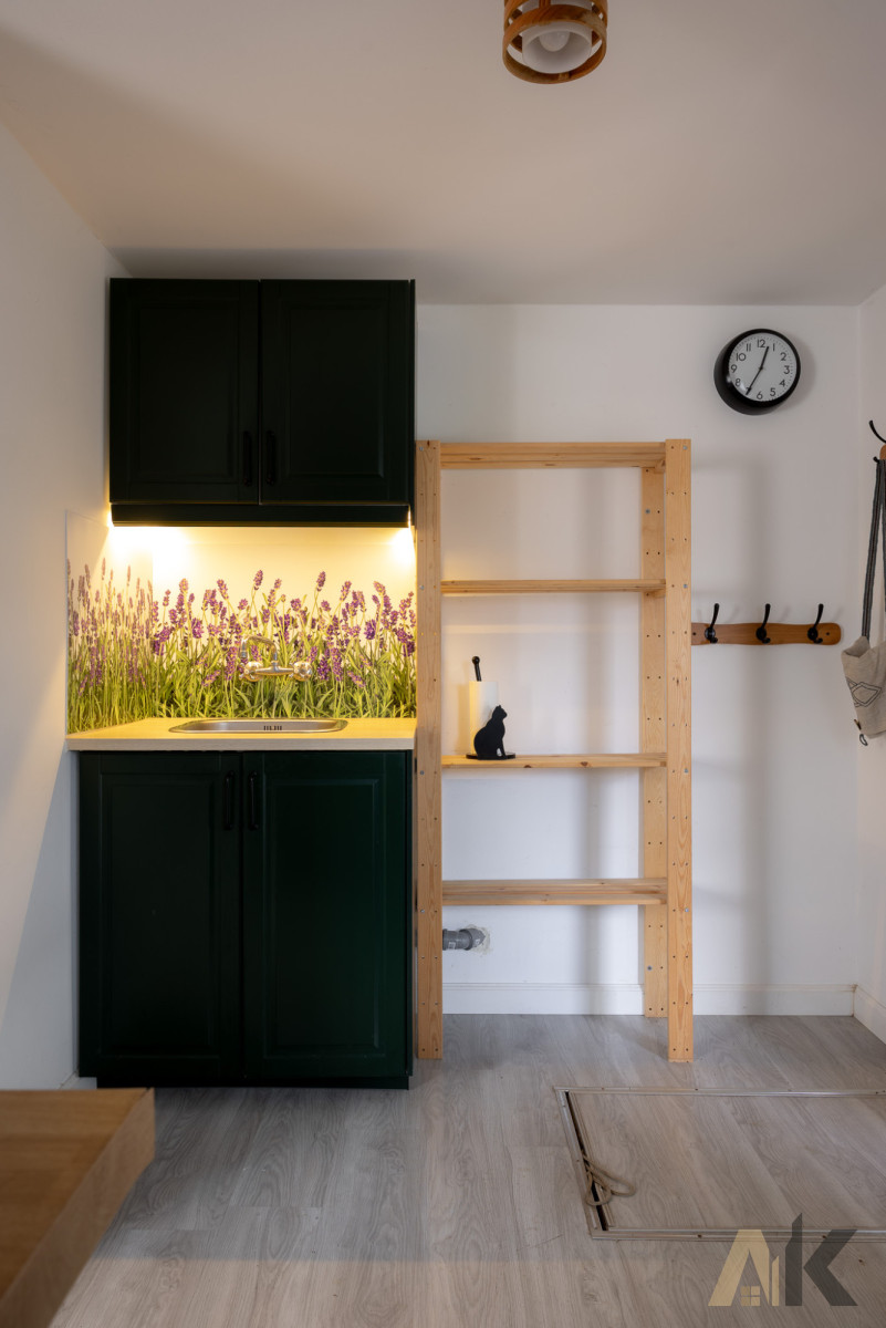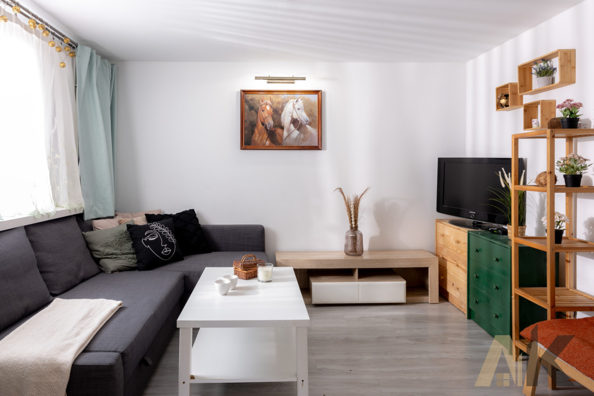 Rozkład pomieszczeń: Kuchnia, przestronny salon, sypialnia oraz łazienka z prysznicem.