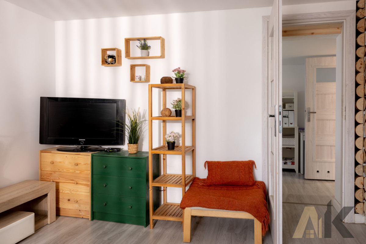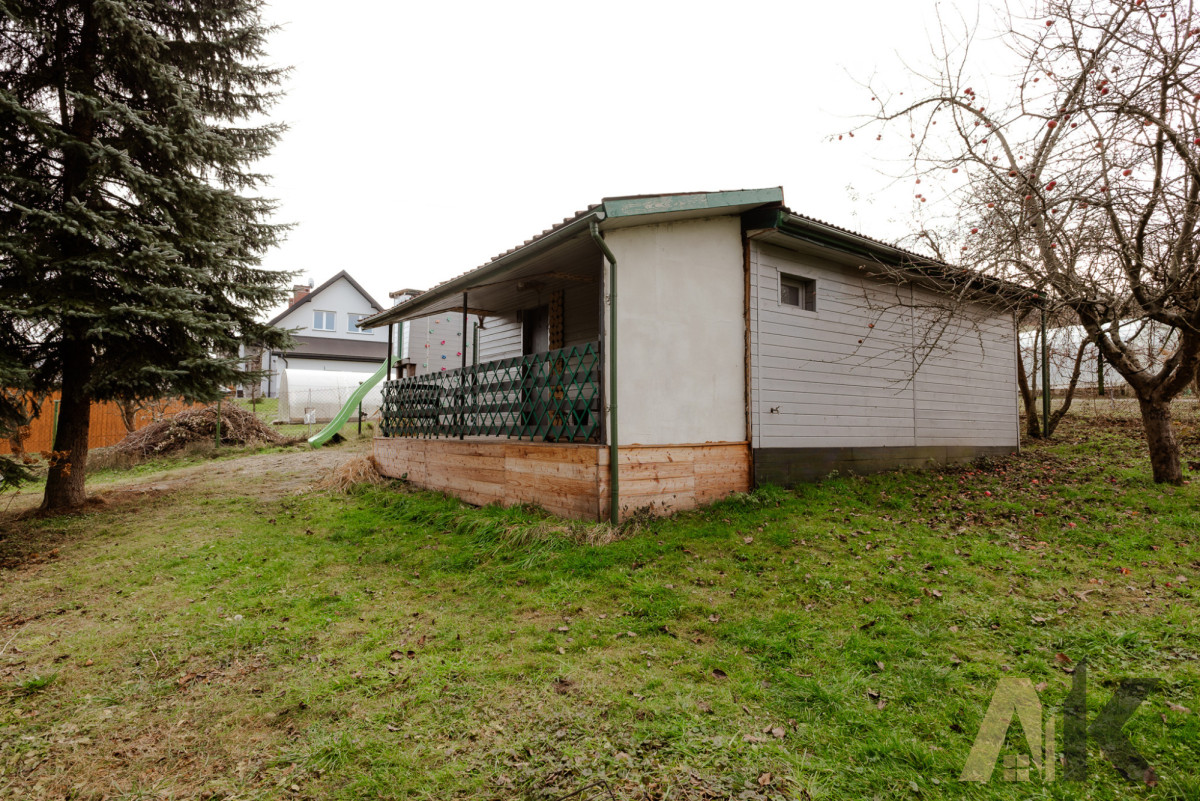 Na działce znajduje się zadbany, drewniany domek o powierzchni 36 m², gotowy do natychmiastowego użytkowania:
