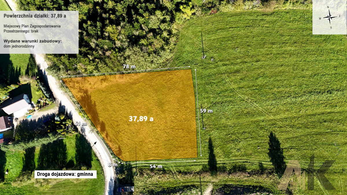 Bezpośredni dojazd- wjazd na działkę prosto z drogi gminnej.