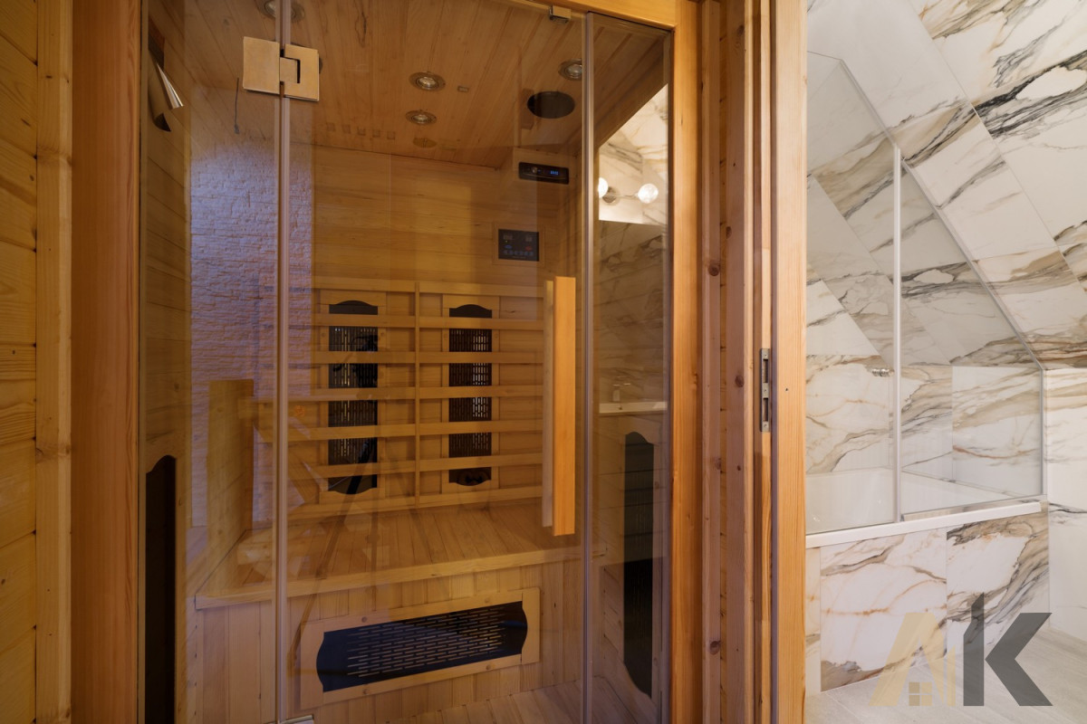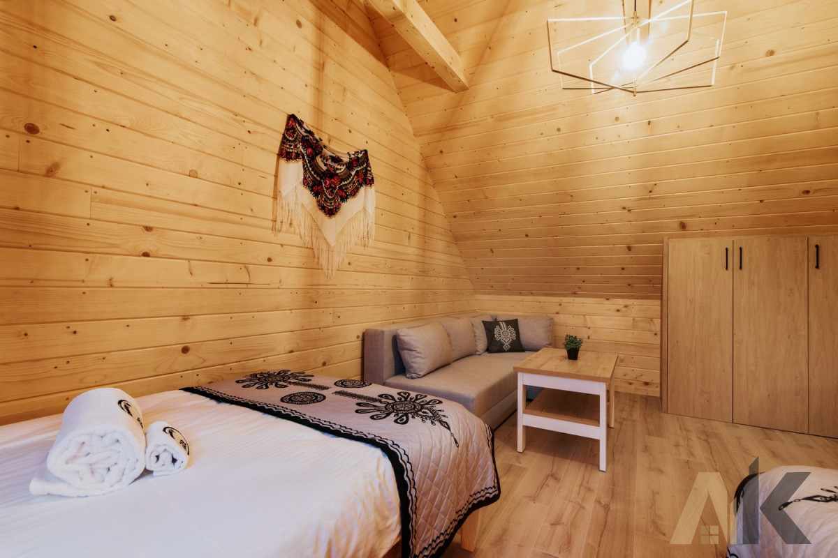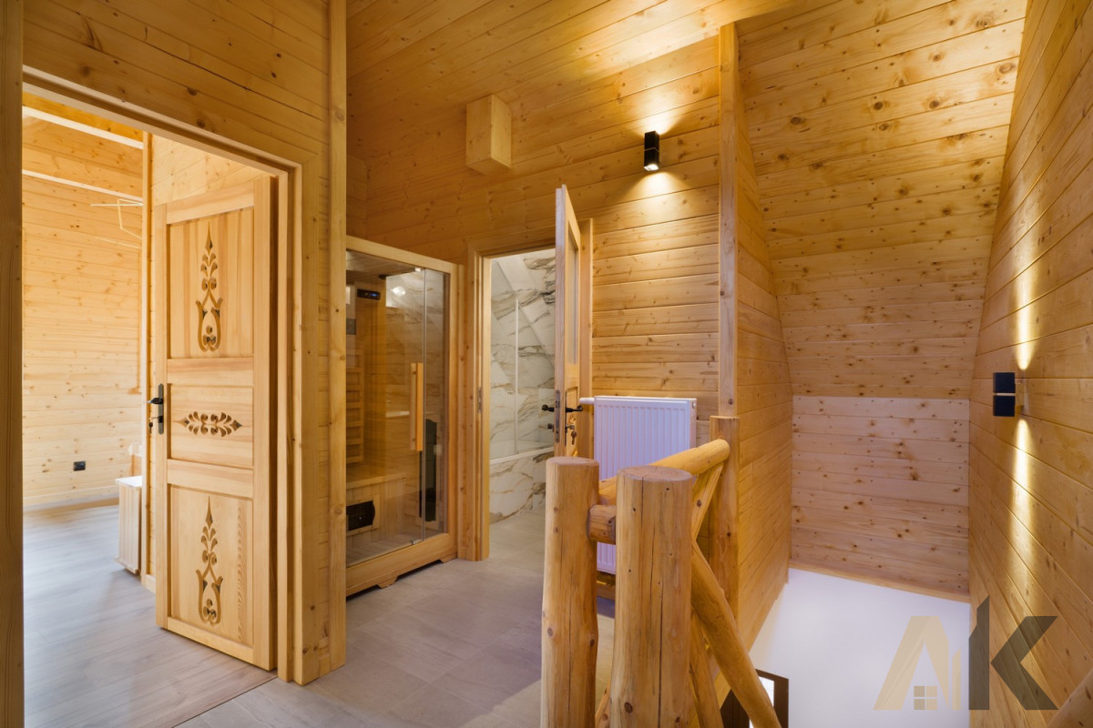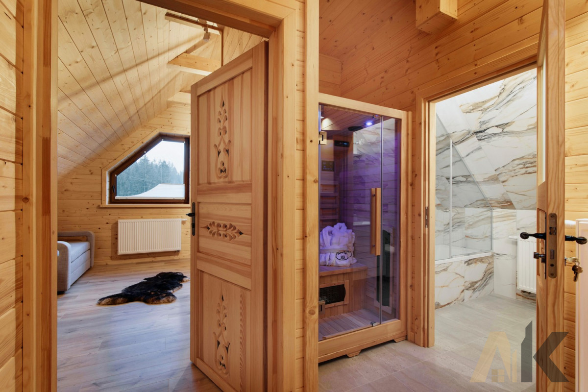 - Piętro z dwiema sypialniami, łazienką i... sauną!
