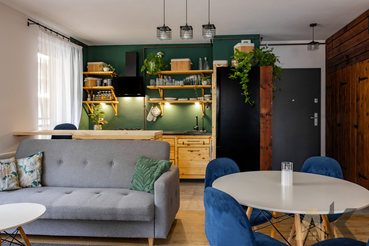 -pokój dzienny z otwartą dobrze doposażoną kuchnią