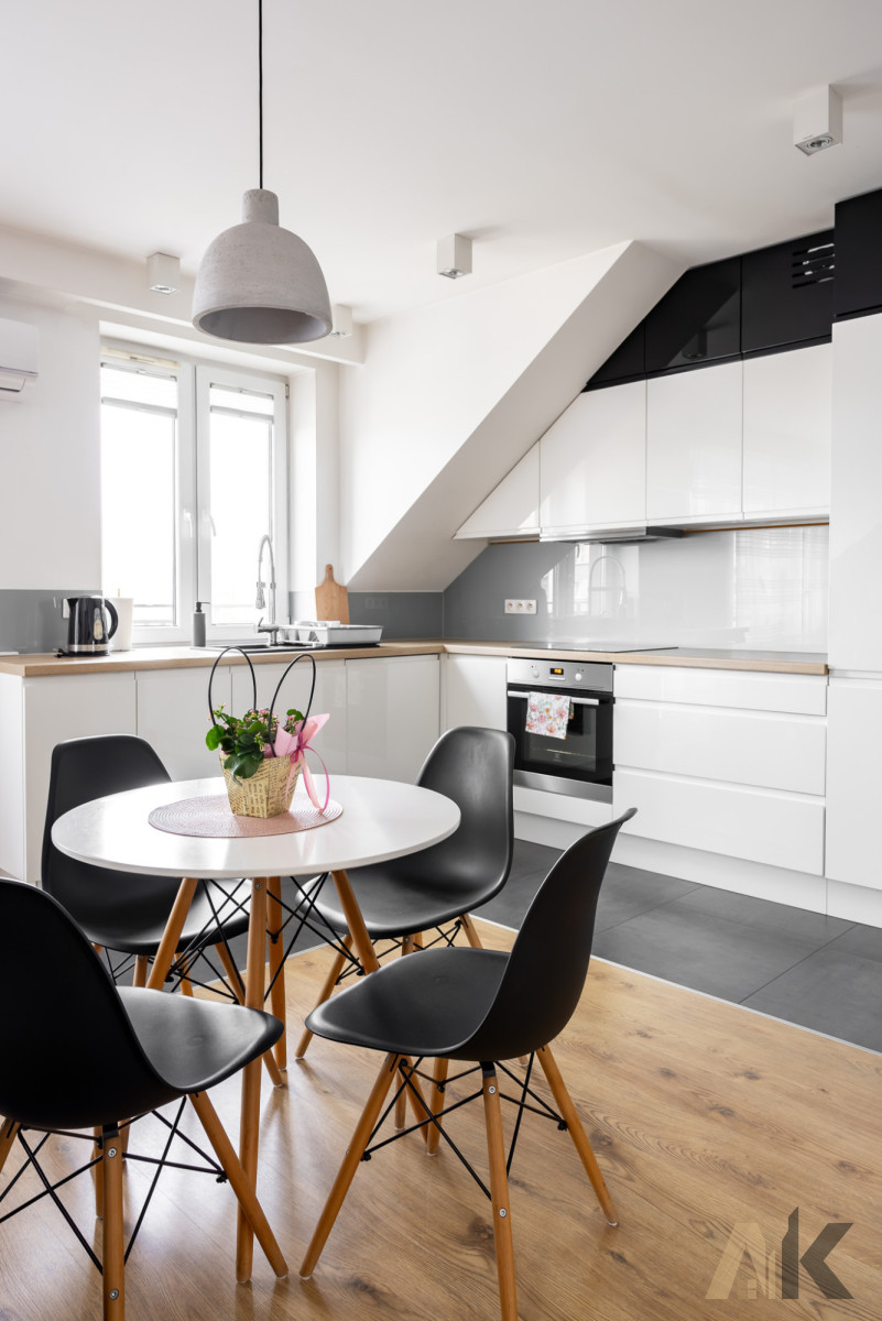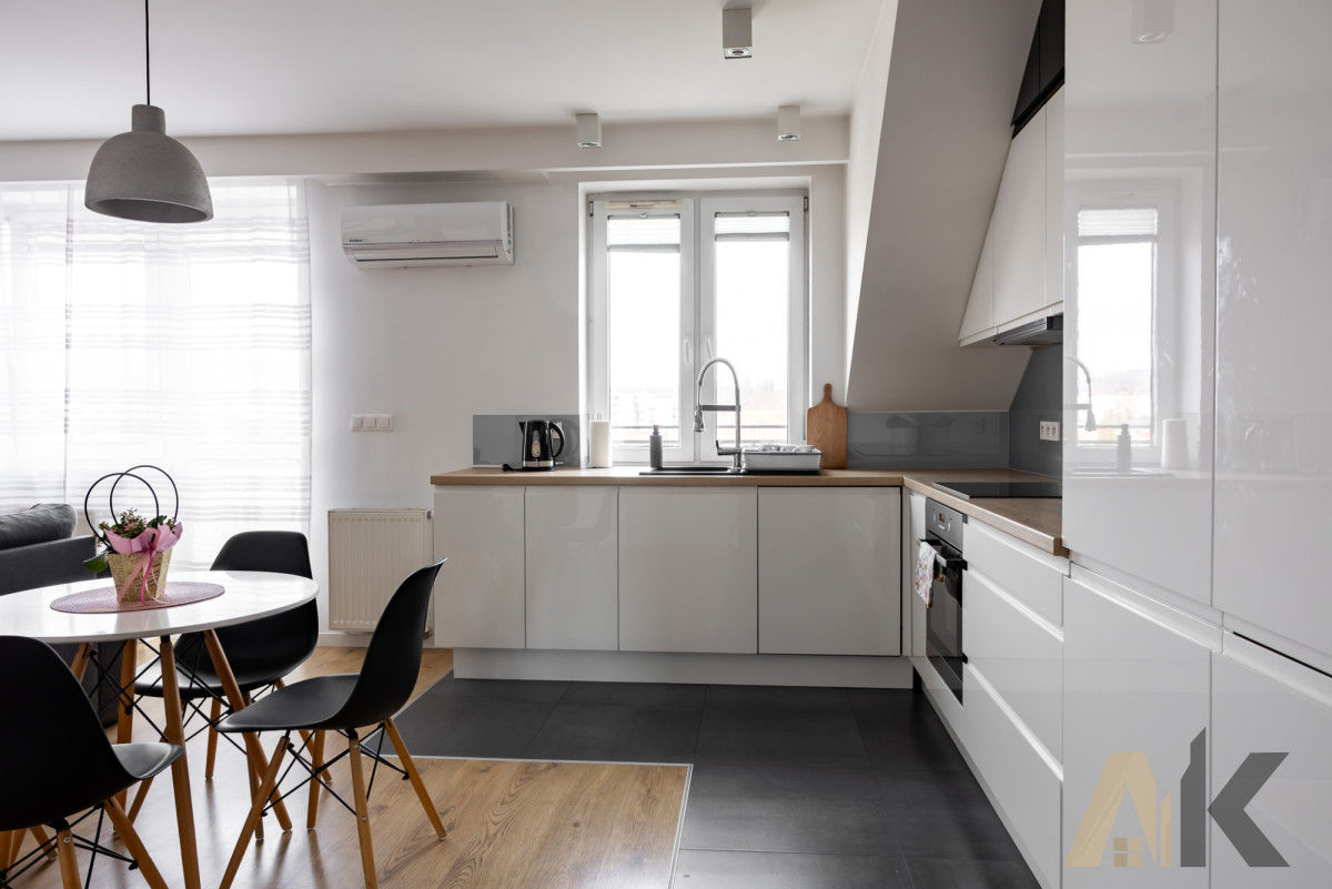 Kuchnia: otwarta, w pełni wyposażona, umożliwiająca swobodne przygotowywanie posiłków. W zabudowie kuchennej: zlewozmywak, zmywarka, lodówka, piekarnik płyta indukcyjna, okap w zabudowie meblowej.
