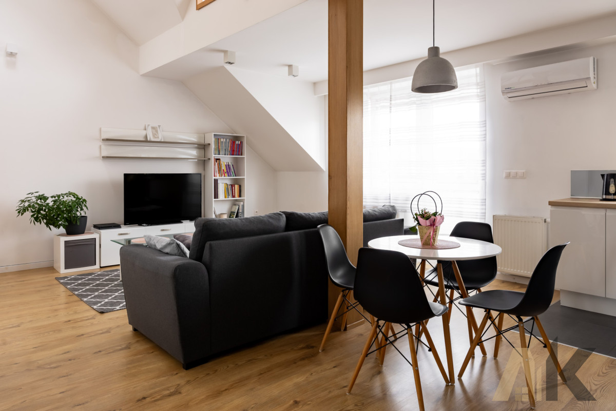 Salon: sofa, stolik z krzesłami, wyjściem na słoneczny balkon z klimatyzacją!